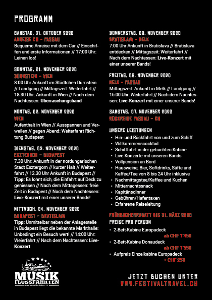Vom 31. Oktober 2020 - 7. November 2020 findet die erste Metal Cruise auf der Donau statt. Mit dabei sind fünf Schweizer Metal Bands (Poltergeist, Emerald, Fire Rose, Broken Fate, Xordia), die das Schiff rocken werden. Es ist eine All-Inklusive-Party inkl. Hin- und Rückfahrt aus der Schweiz zum Schiff in Passau. Mit Besichtigung von u.a. Budapest, Bratislava und Wien. Bis zum 31. März gibts noch einen Frühbucherrabatt von 100 CHF. Alle Infos dazu findet ihr hier: